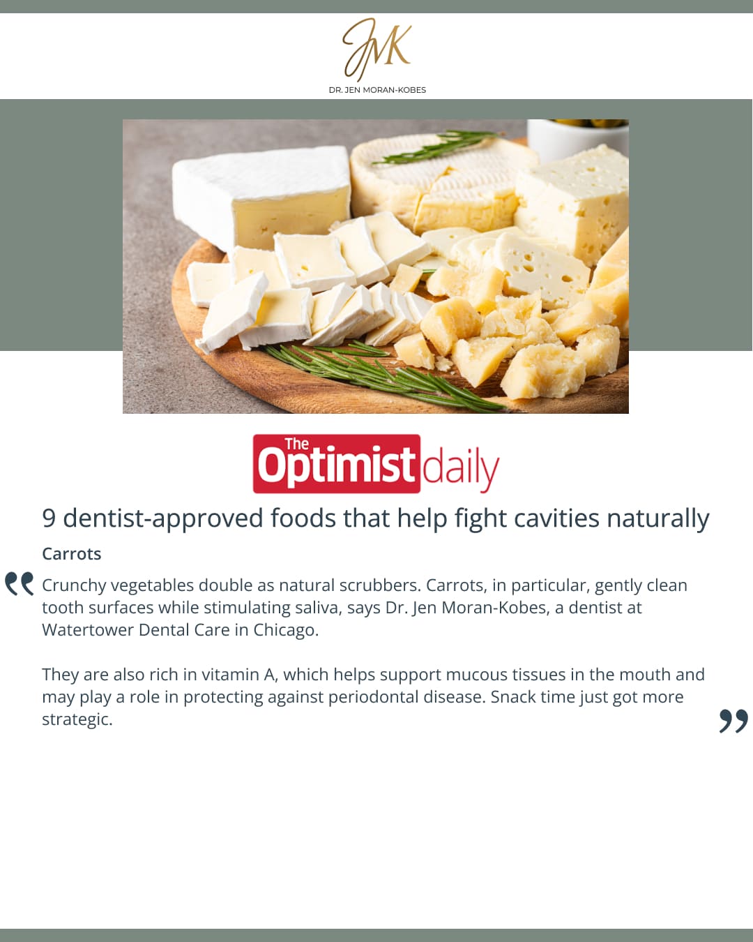 Crunchy vegetables double as natural scrubbers. Carrots, in particular, gently clean tooth surfaces while stimulating saliva, says Dr. Jen Moran-Kobes, a dentist at Watertower Dental Care in Chicago. They are also rich in vitamin A, which helps support mucous tissues in the mouth and may play a role in protecting against periodontal disease. Snack time just got more strategic.